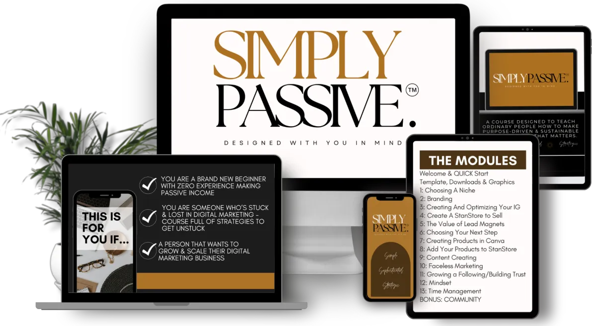 Simply Passive is a simple on-ramp for beginners to learn how to make passive income from home (or anywhere) and is packed with the strategies & tools you need to bring LIFE to your digital marketing business. Built on serving. Built on strategies. Built on integrity.